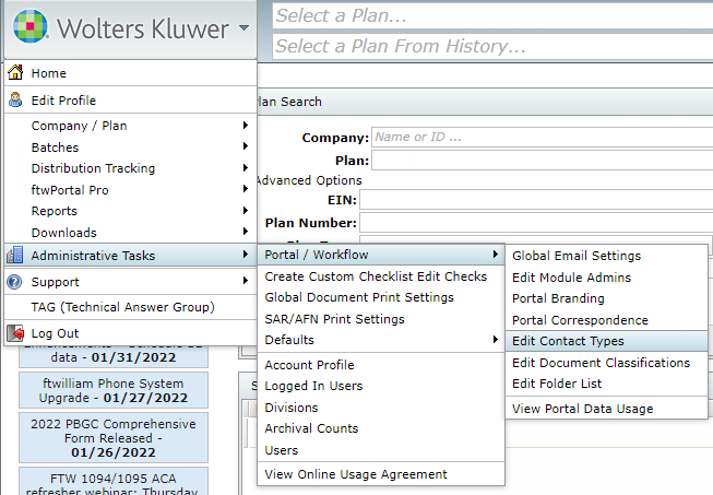Select the Wolters Kluwer Logo > Administrative Tasks > Portal/Workflow > Edit Contact Types