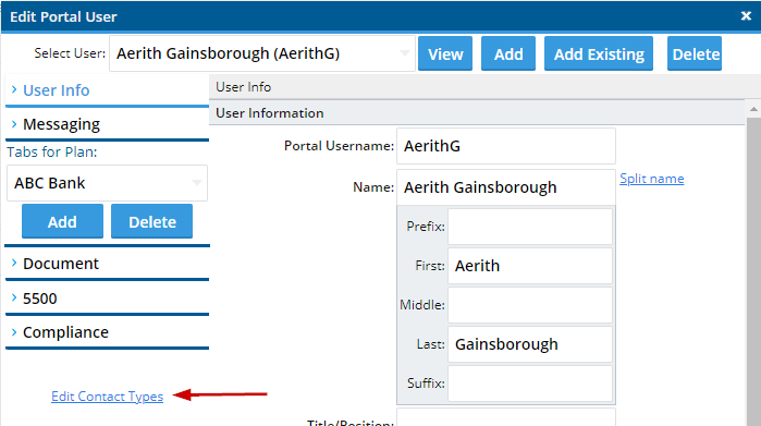 Once the Portal User is selected, permissions may be set by either selecting a contact type from within the 'User Info' tab: