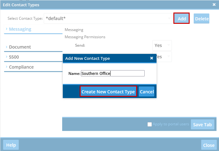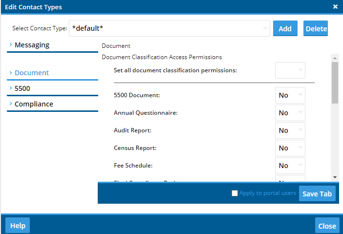 The *default* Contact Type defines the permissions applied when a portal user is added to the software, if a specific Contact Type is not selected at the time the portal user is created.