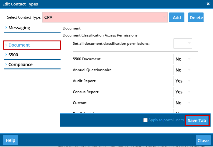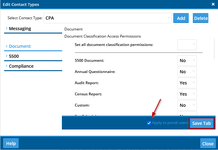 - Select the checkbox next to Apply to portal users followed by Save Tab