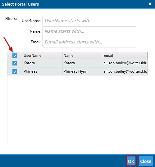 - Users may be selected by either by scrolling through the list or using the filters at the top of the window